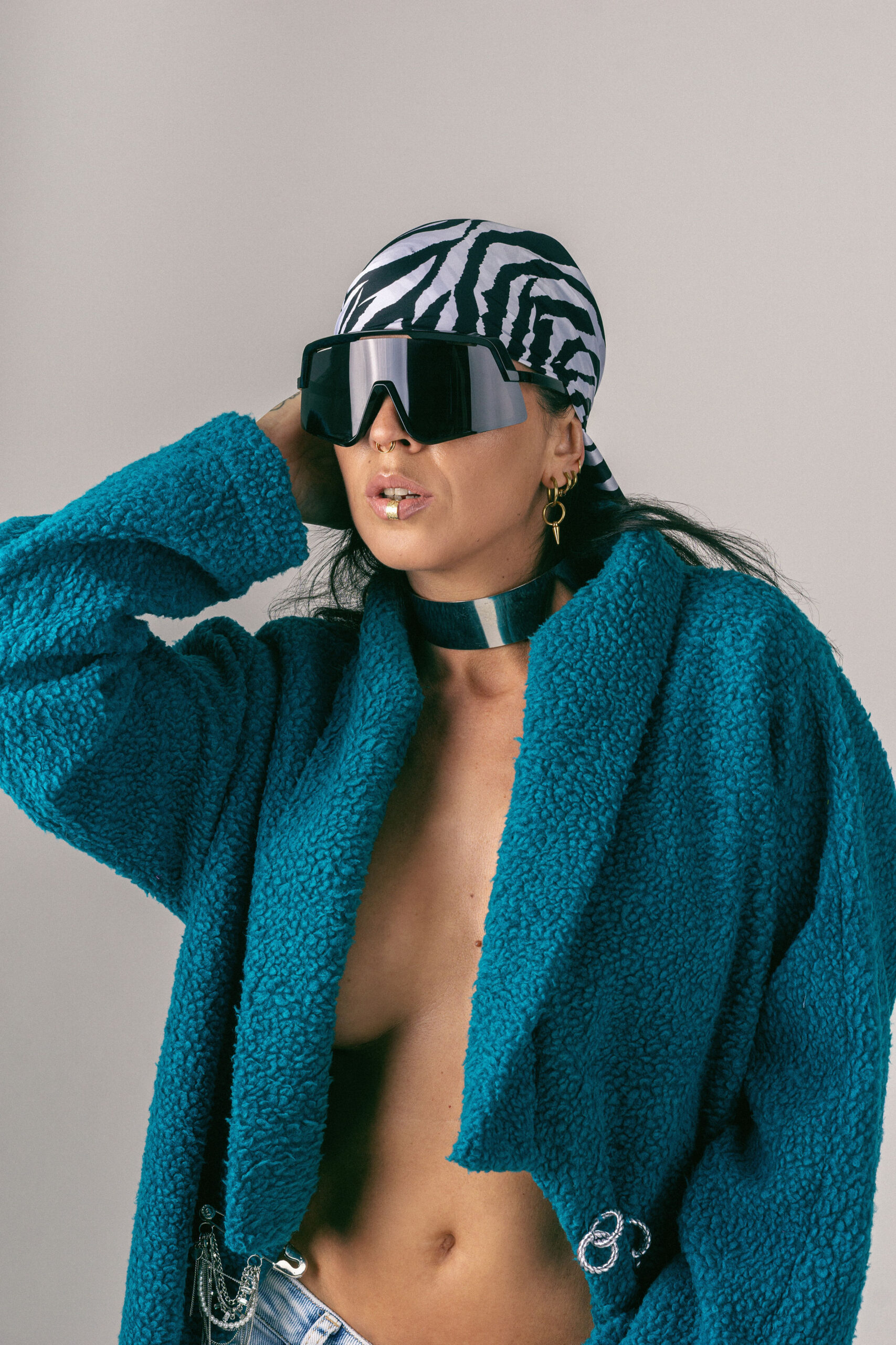 Chaquetón Destello, pieza única y exclusiva con un cuello original con diferentes posiciones.