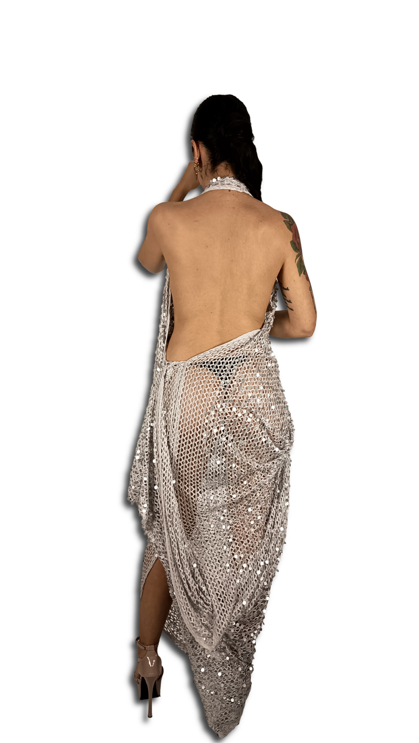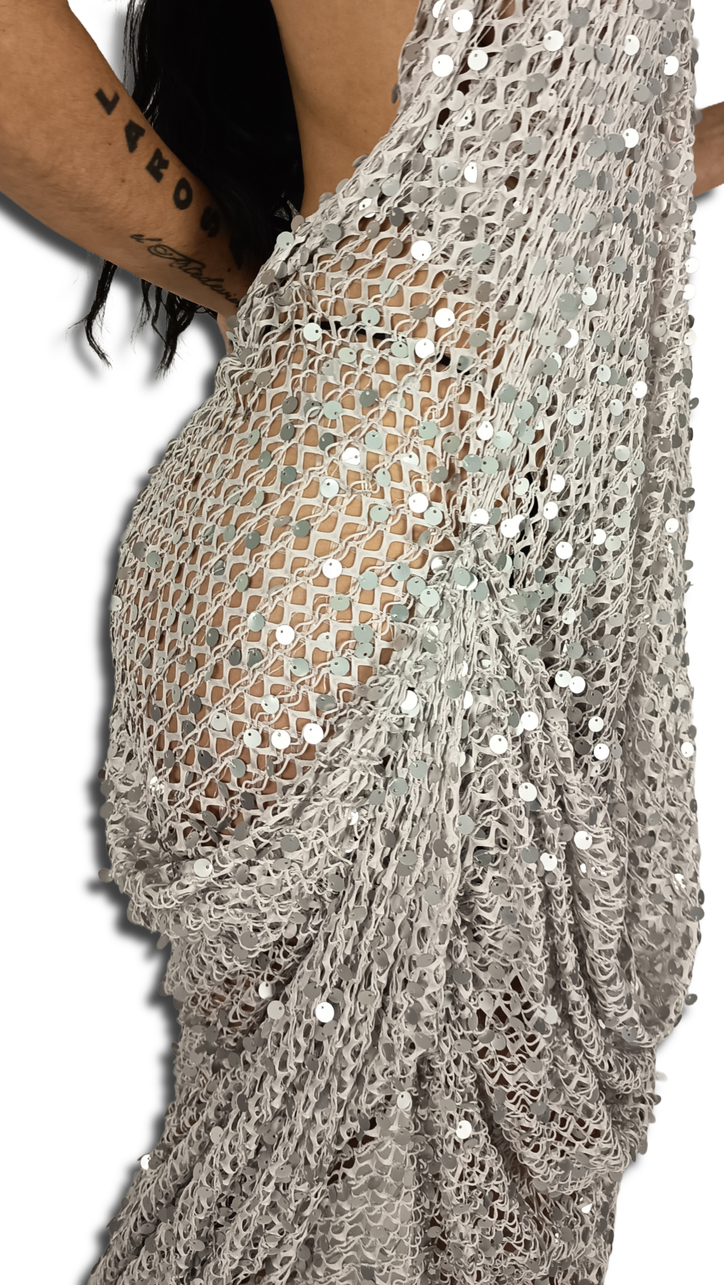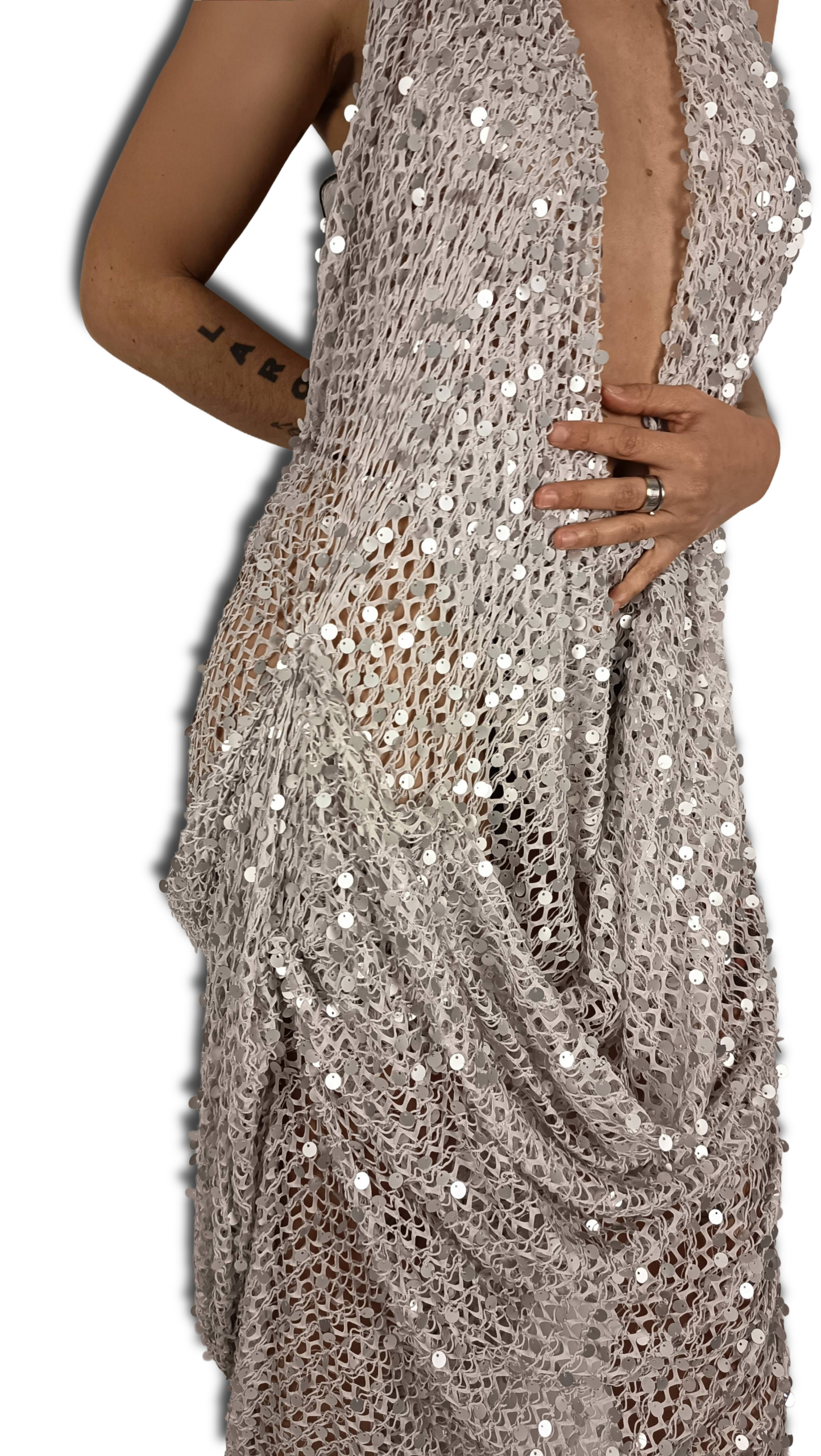 Vestido color grisáceo de lentejuelas,es un material delicado .